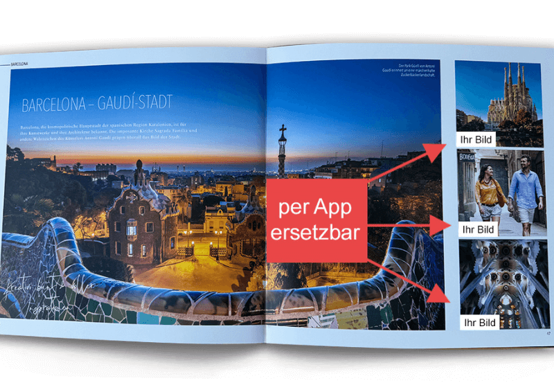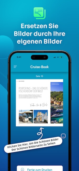 In dieser Ausführung können Sie sogar viele der im CruiseBook vorhandenen Bilder durch eigene Fotos ersetzen. Dazu laden Sie die kostenlose CruiseBook App.